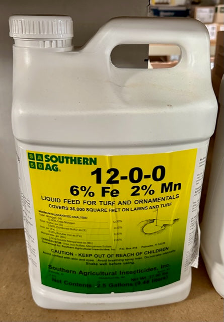 Chelated Liquid Iron Fertilizer Corrects Iron deficiency in flowers, vegetables, shrubs & trees. Can also be used on lawns for a deep, rich green color. Contains: Iron 6%. Use on: Flowers, shrubs, trees, vegetables and lawns. Controls: Iron deficiency (yellowing foliage) Application: Mix with water.